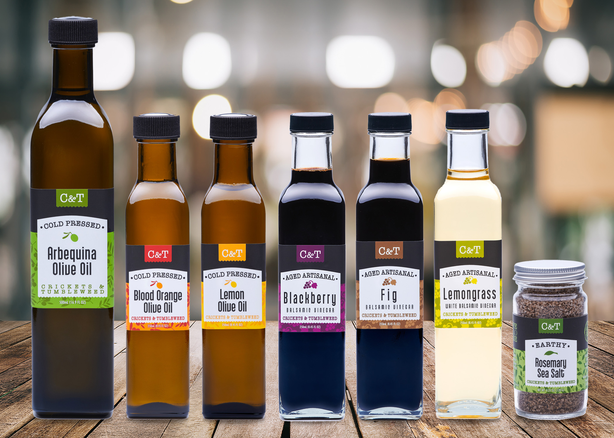 500 ml Arbequina Olive Oil, 250 ml Lemon Olive Oil, 250 ml Orange Olive Oil, 250 ml Balsamic, 250 ml Fig Balsamic, Blackberry Balsamic, Lemongrass White Balsamic, and Rosemary Sea Salt.